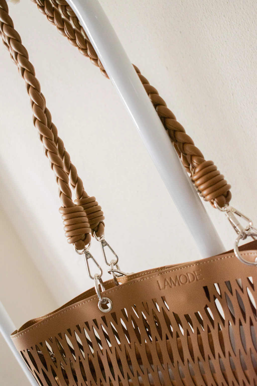 Cuenta con dos straps que se adaptan a tus necesidades: uno corto con una elegante trenza que aporta un detalle artesanal y femenino, y otro más largo para llevarla al hombro o cruzada, asegurando versatilidad en tu look diario.