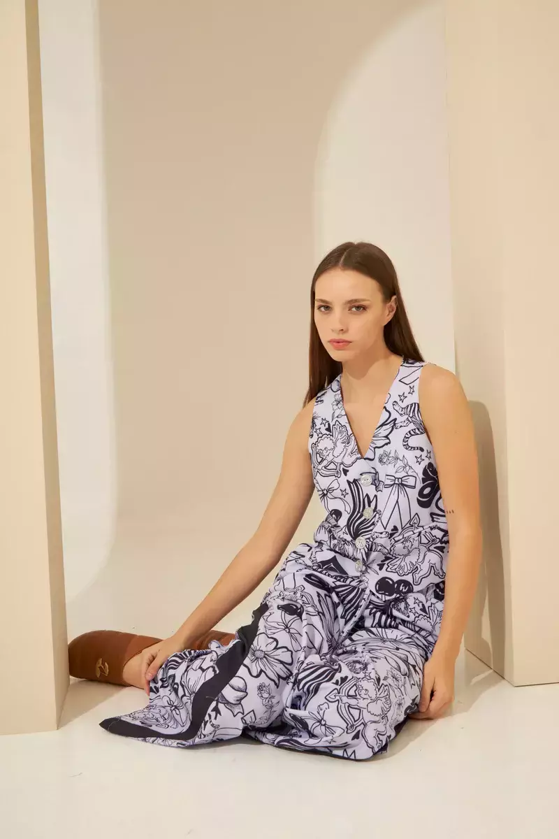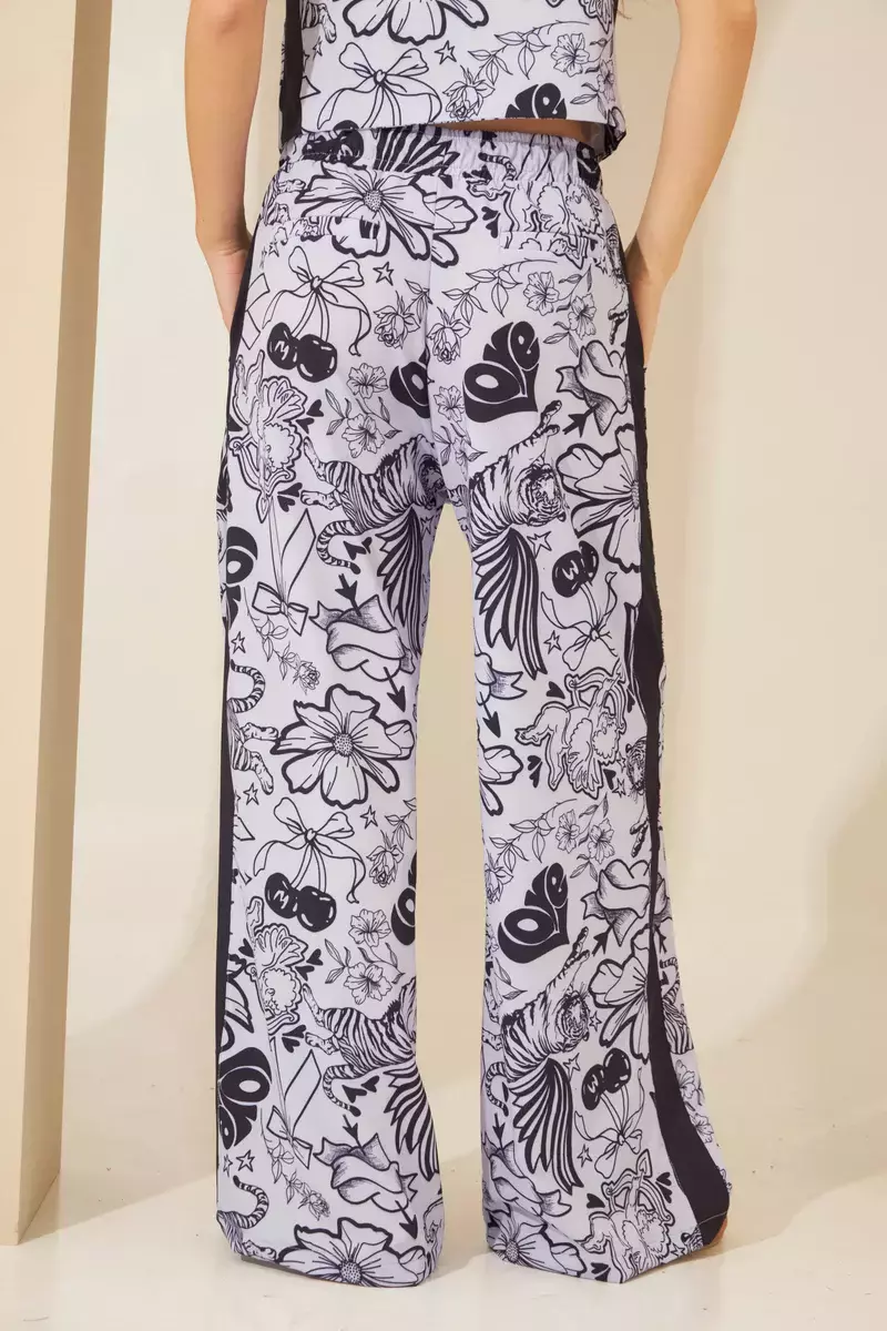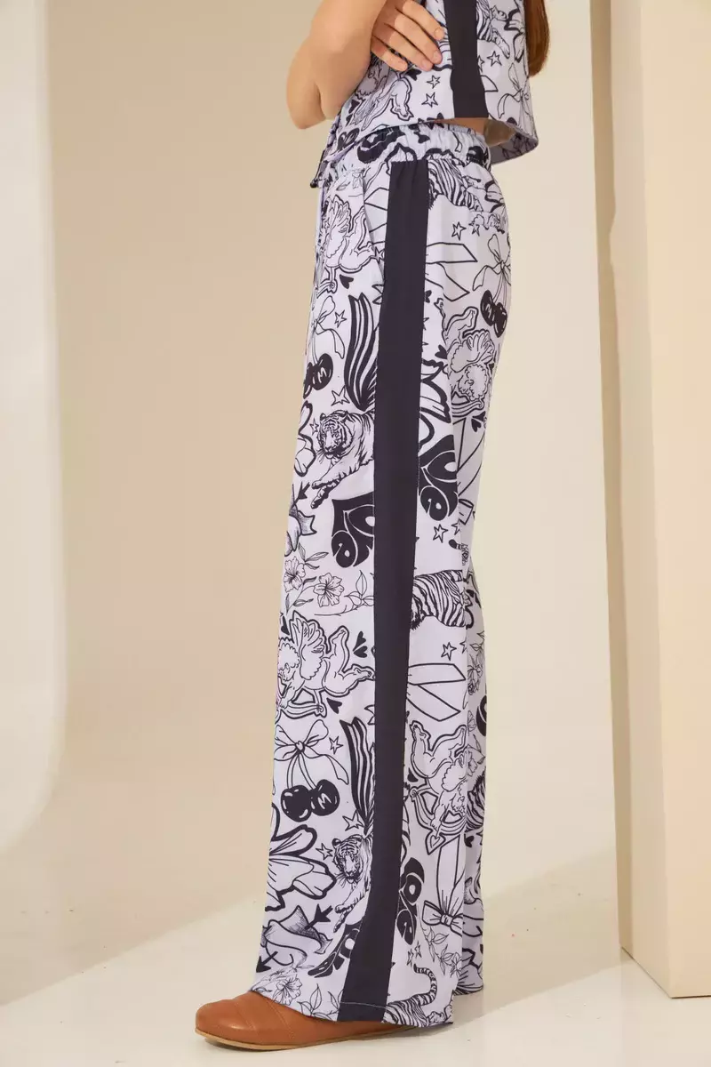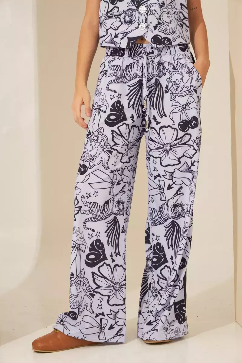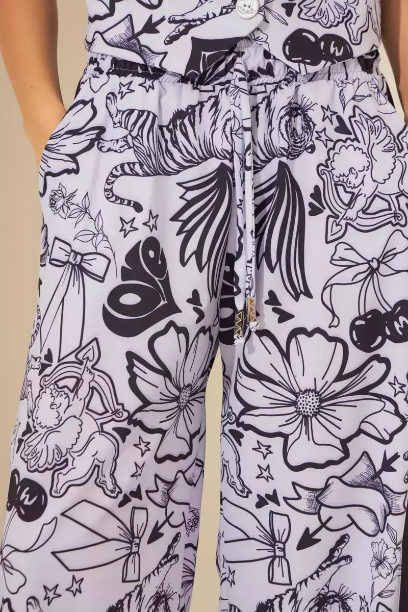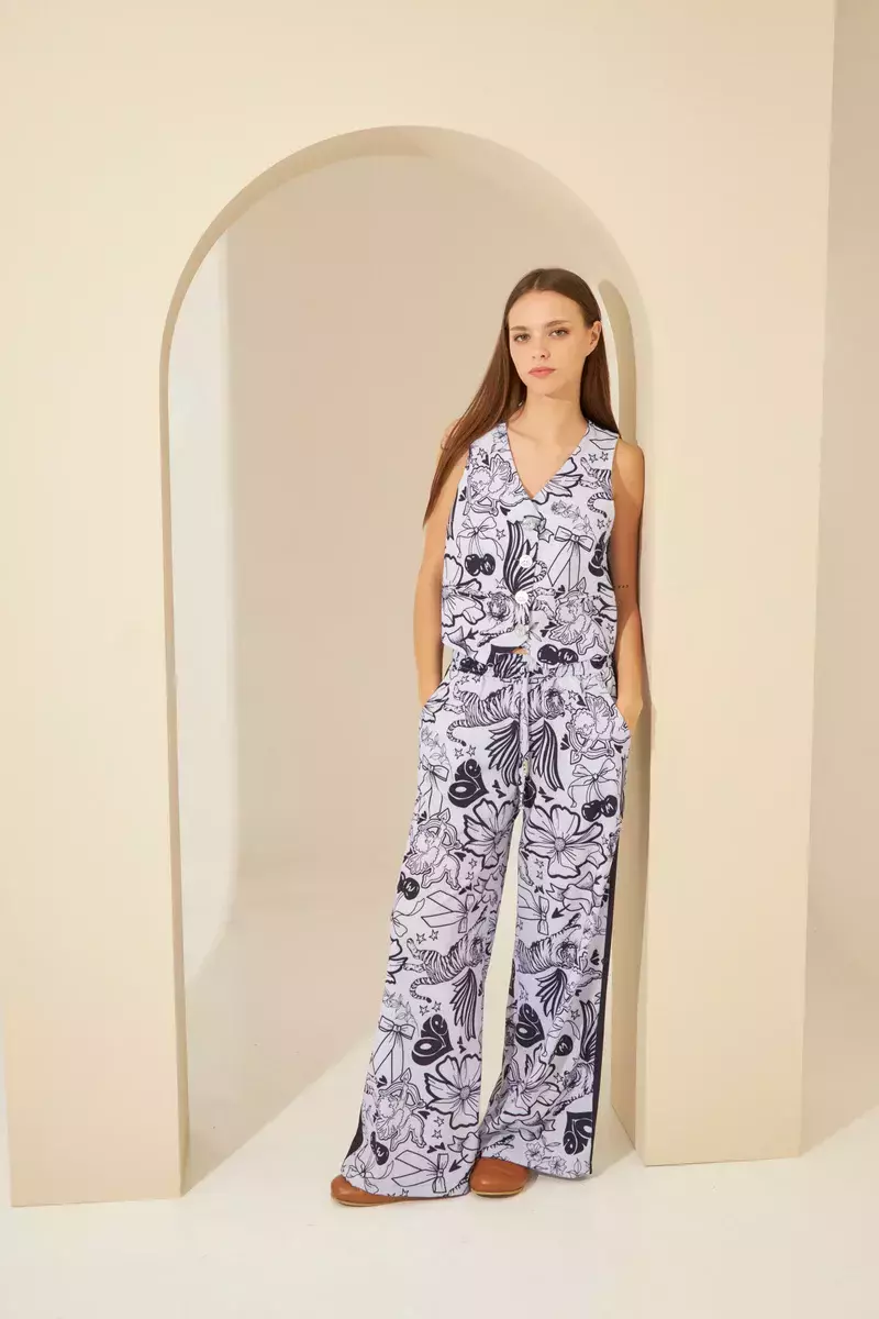 Pantalón Palazzo de twill sastrero en estampa exclusiva Millie. Tiene cintura elastizada, bolsillos ojales en la espalda y recorte liso a tono en el lateral. Completa el look el Chaleco Madison.
