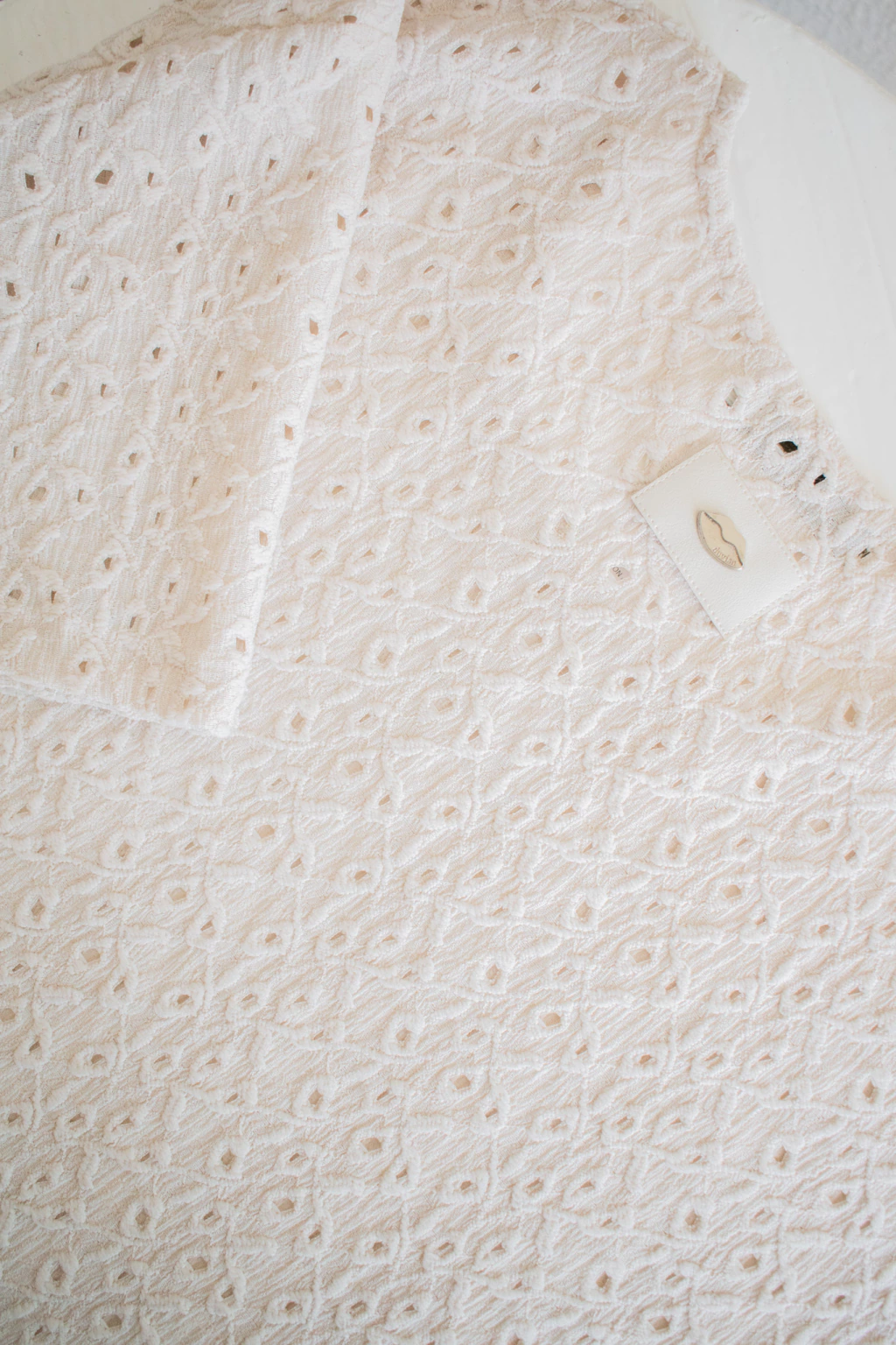 Confeccionado en un broderie depunto calado, aporta textura,liviandad y un toque sutil detransparencia.